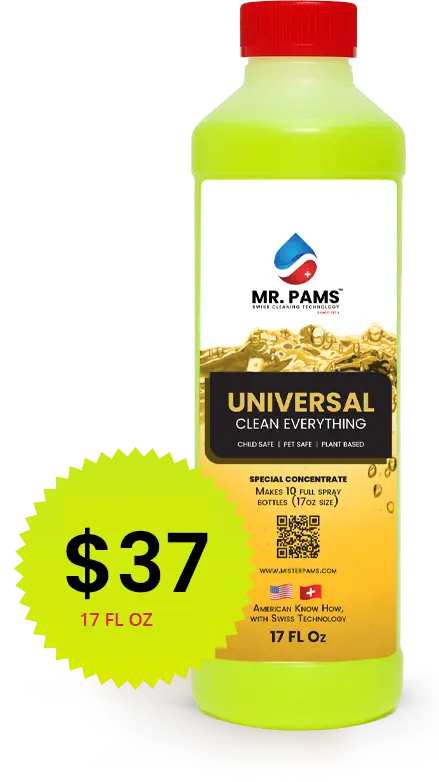 Mr. Pams Universal is a product that does not require rinsing, and has a unique dosage equivalent to 10% concentrate and 90% water. There is no need to add more concentrate, and there is no risk to surfaces that can withstand water contact.